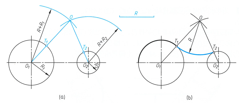②连0O1、0O,交两已知圆弧于T1、T2,即为两切点;以0为圆心,R为半径,由T到T2作圆弧即为所求,最后加粗。