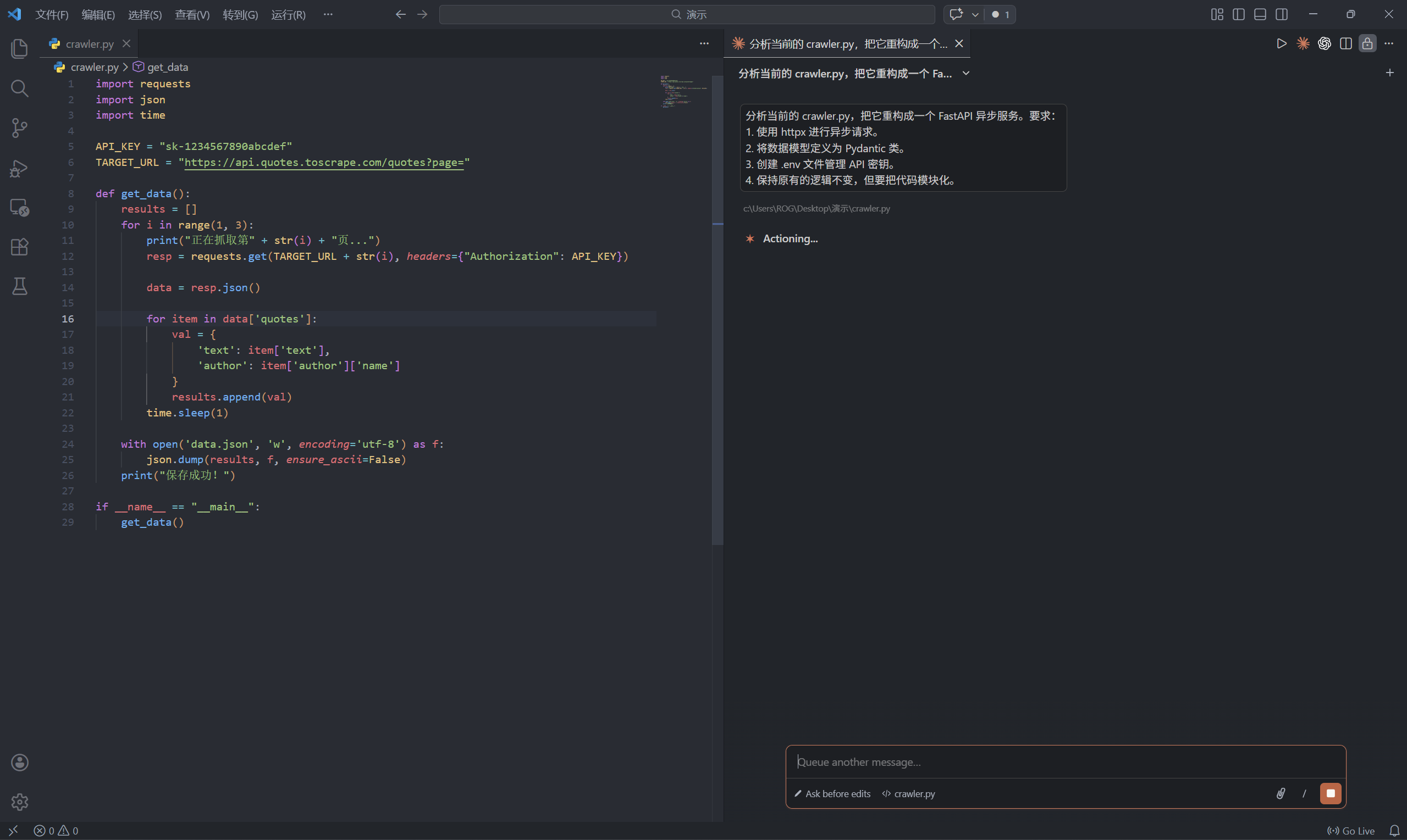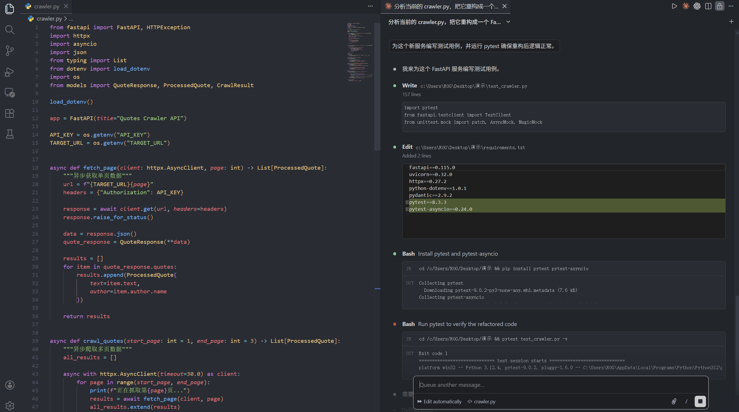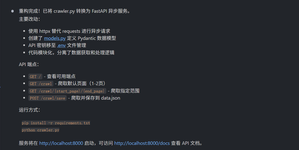 claude "分析当前的 crawler.py,把它重构成一个 FastAPI 异步服务。要求: