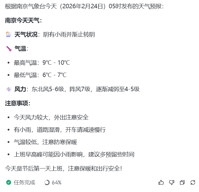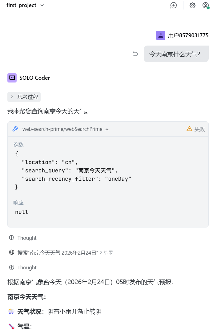 但是大家可以看到的是:Vibe Coding工具,做的事情不仅仅是给你编出一套程序,它还可以帮你做数据处理。也就是说,其实它也是一个带MCP功能的LLM对话工具,甚至你问它,今天南京什么天气,它都会回答你: