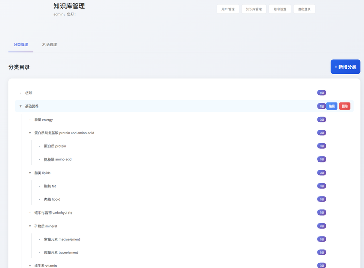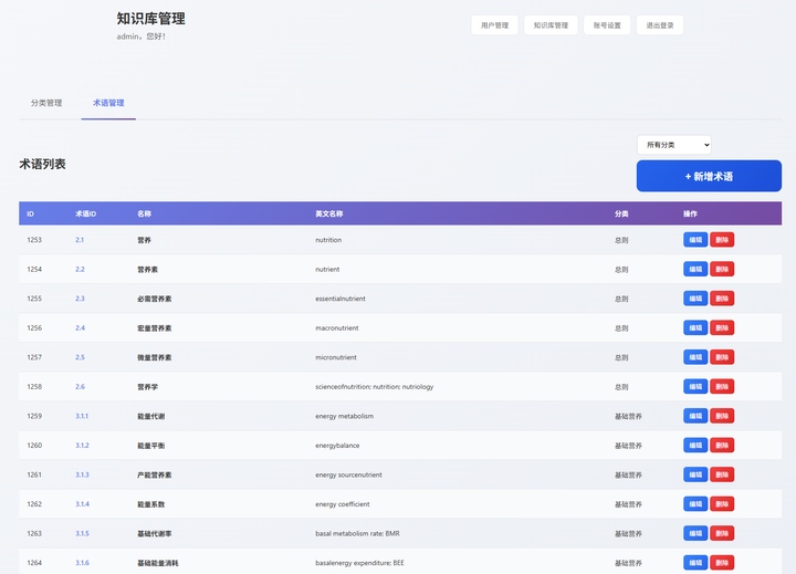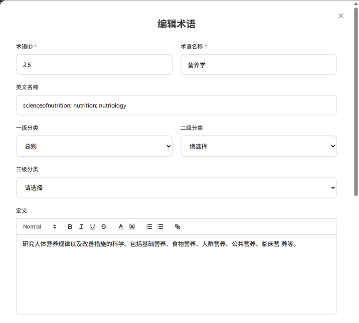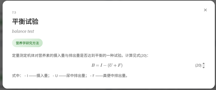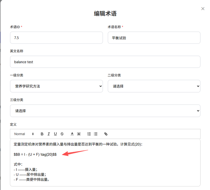 提供了对营养学术语的分类和术语编辑功能,支持Latex语法。