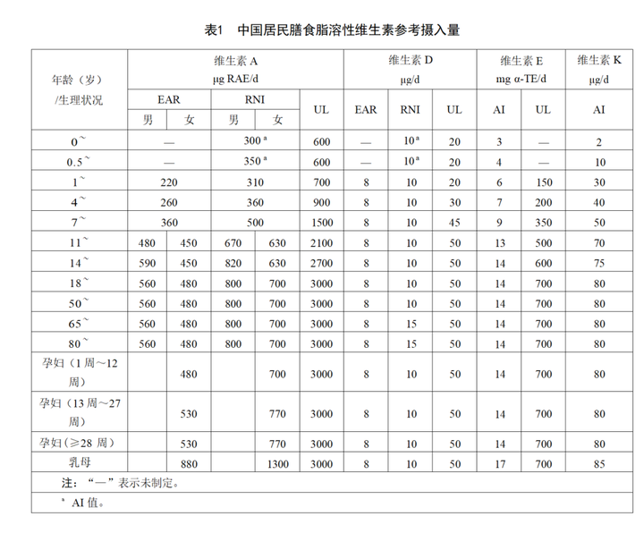 每日脂溶性维生素摄入量推荐: