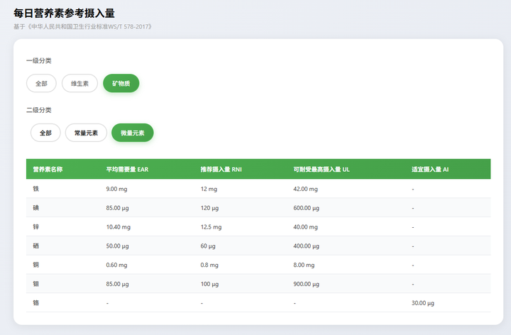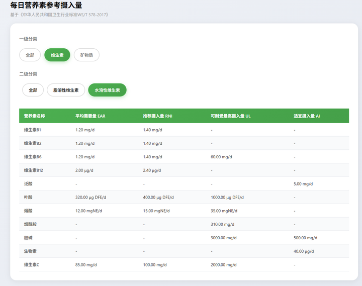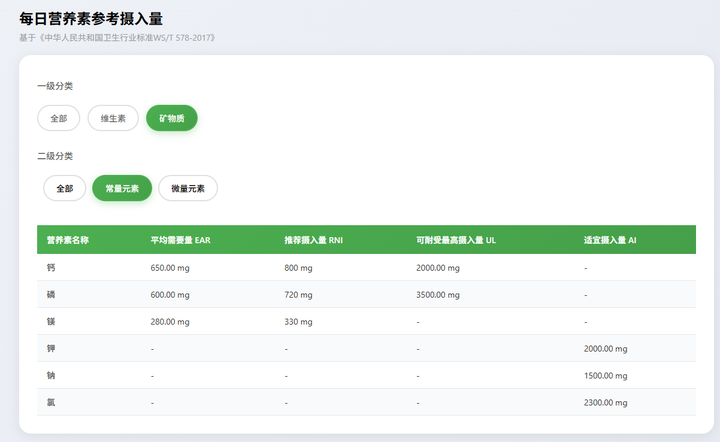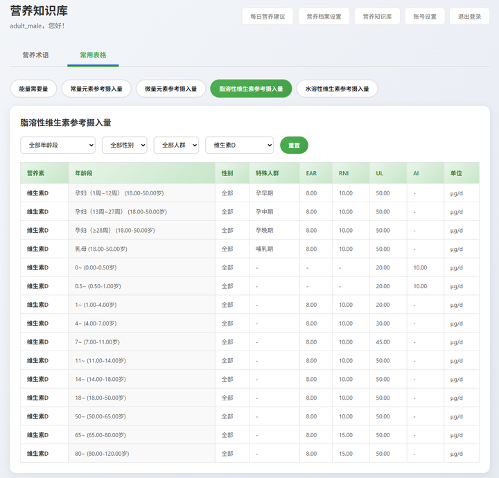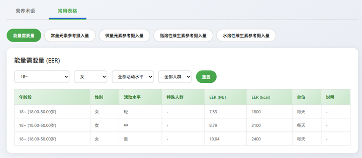用户可以检索常用的能量需要量、维生素和矿物质的摄入量的专业数据: