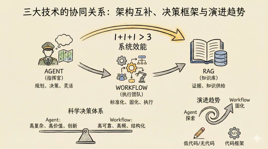 三者互补:Agent灵活但需可控,Workflow可控但需指令,RAG可靠但需调用。结合后,以 Agent的智能 包容 Workflow的可靠,并依靠 RAG的可信 保障输出根基。