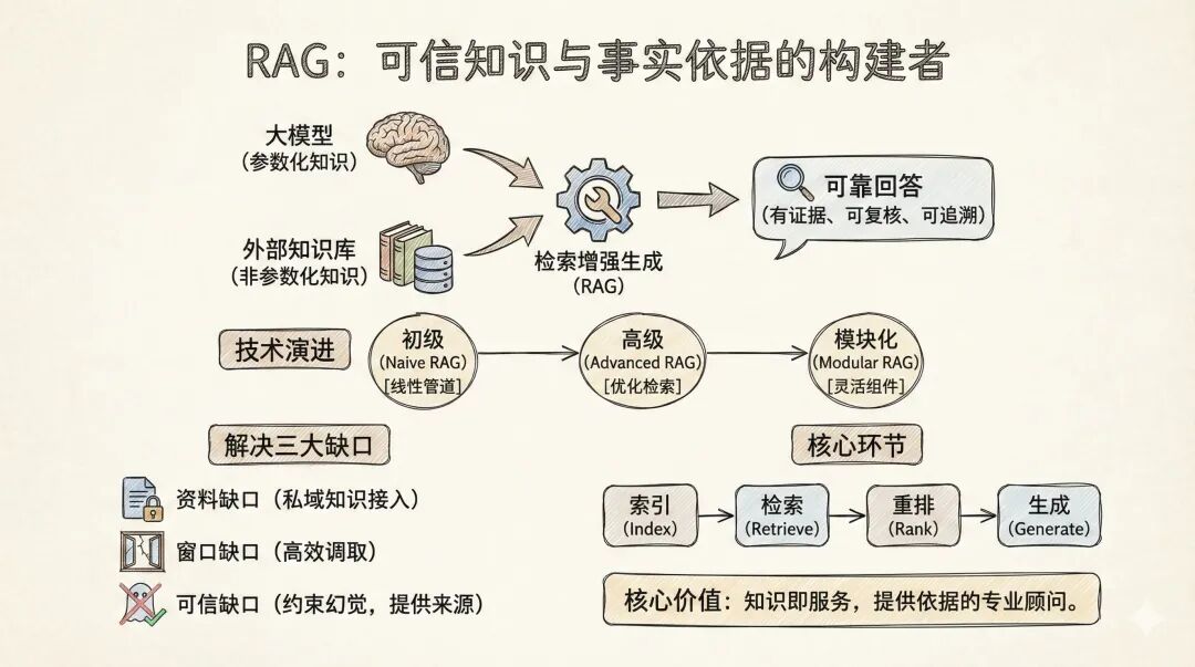 - 可信缺口:模型的“幻觉”是商业应用的致命伤。RAG为每个关键陈述提供明确的来源引用,使答案可追溯、可验证,极大提升信息可信度与合规性,从机制上约束幻觉。