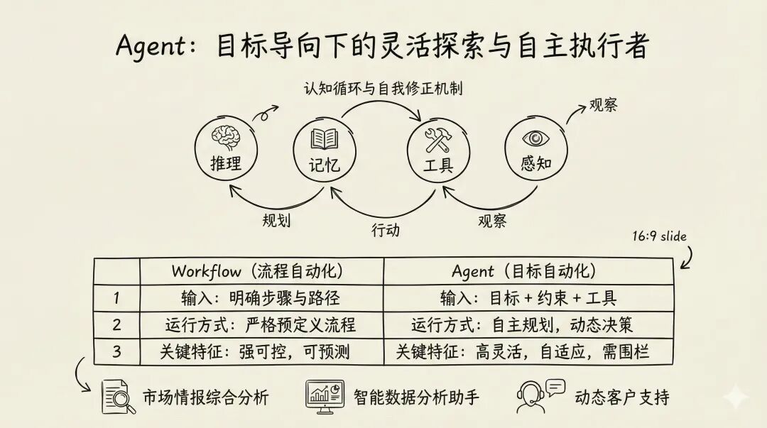 Workflow解决了“流程自动化”问题,但前提是路径必须预先定义。然而,企业中大量任务目标明确,路径却不明确、需要探索。这正是 Agent(智能体)的舞台:实现“目标自动化” 。智能体是一个具备自主性的虚拟员工,接受目标、可用工具集与边界约束后,便能自行规划路径、调用工具、应对意外,最终交付结果。