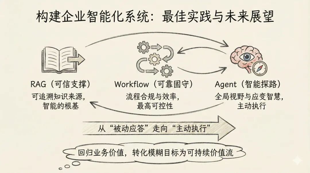 核心原则是探索与固化的螺旋进阶。理想的落地路径是:先用Agent快速探索可行路径,再用Workflow将验证成功的路径固化为企业SOP资产。初期,可借助Agent的灵活性与业务方共创验证可行性;一旦路径清晰稳定,就应沉淀为Workflow,以提升执行效率与可控性。RAG则作为底层知识基础设施,贯穿始终。
