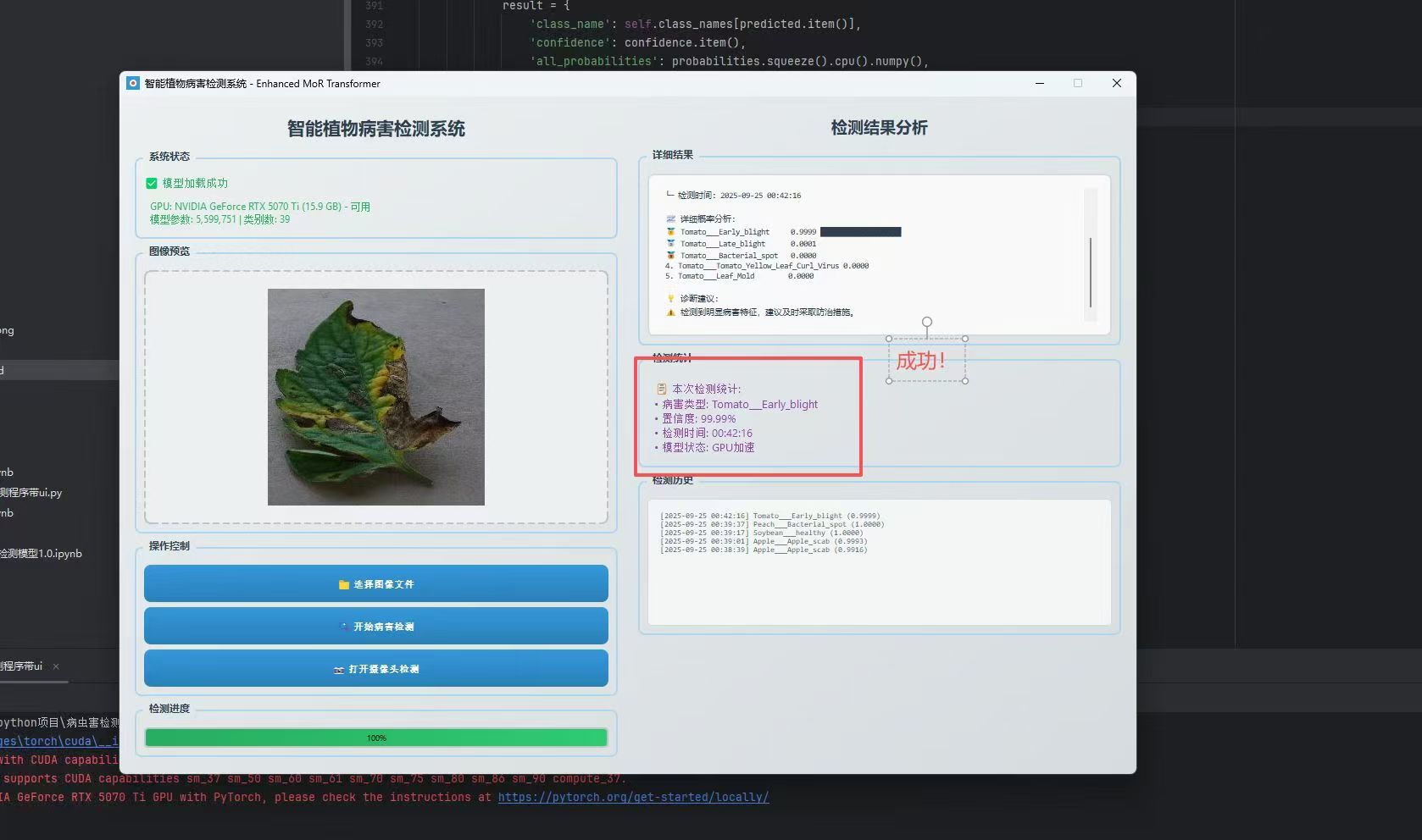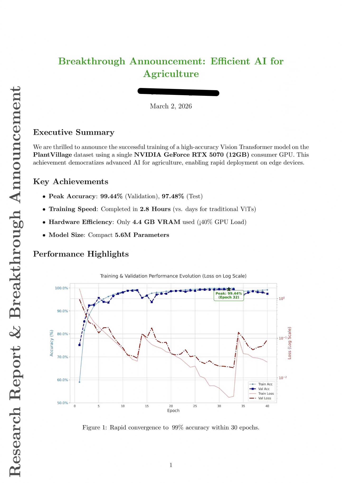 - ✅ 在 PlantVillage 数据集上训练,1小时内收敛,准确率达99.44%;