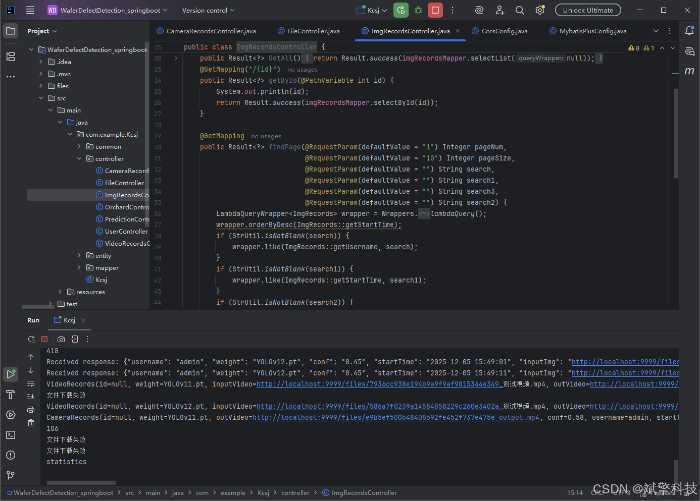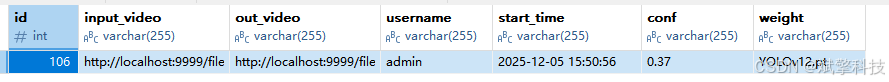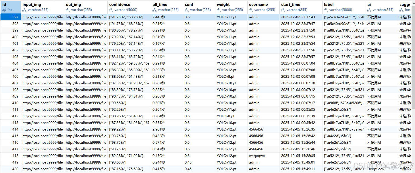 所有检测结果都会自动保存到MySQL数据库,包括原始文件路径、检测时间、使用的模型、缺陷统计等信息。