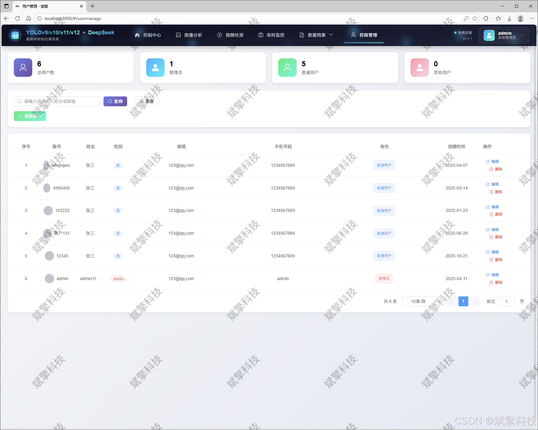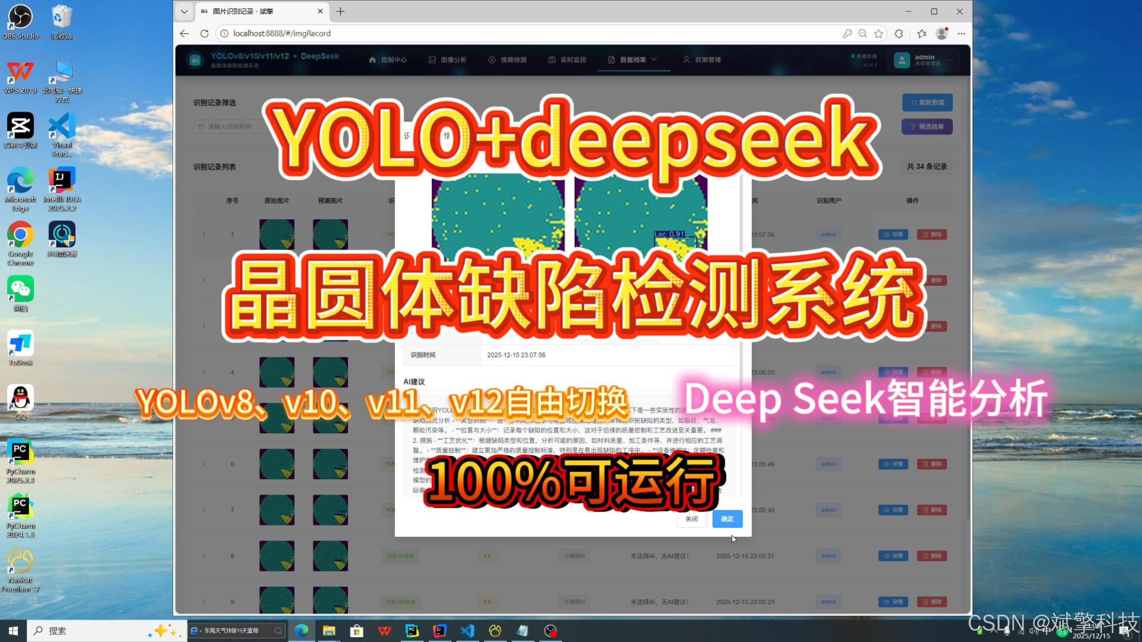 本文提出了一种基于深度学习技术的晶圆体缺陷识别检测系统,该系统集成了当前最先进的YOLO系列目标检测算法(包括YOLOv8、YOLOv10、YOLOv11和YOLOv12),并创新性地融入了DeepSeek智能分析模块。系统采用前后端分离的现代化Web架构,具备完善的用户管理、多模态检测(图像、视频、实时摄像头)、数据可视化和智能分析功能。通过优化的深度学习模型和精心设计的用户界面,本系统能够准确