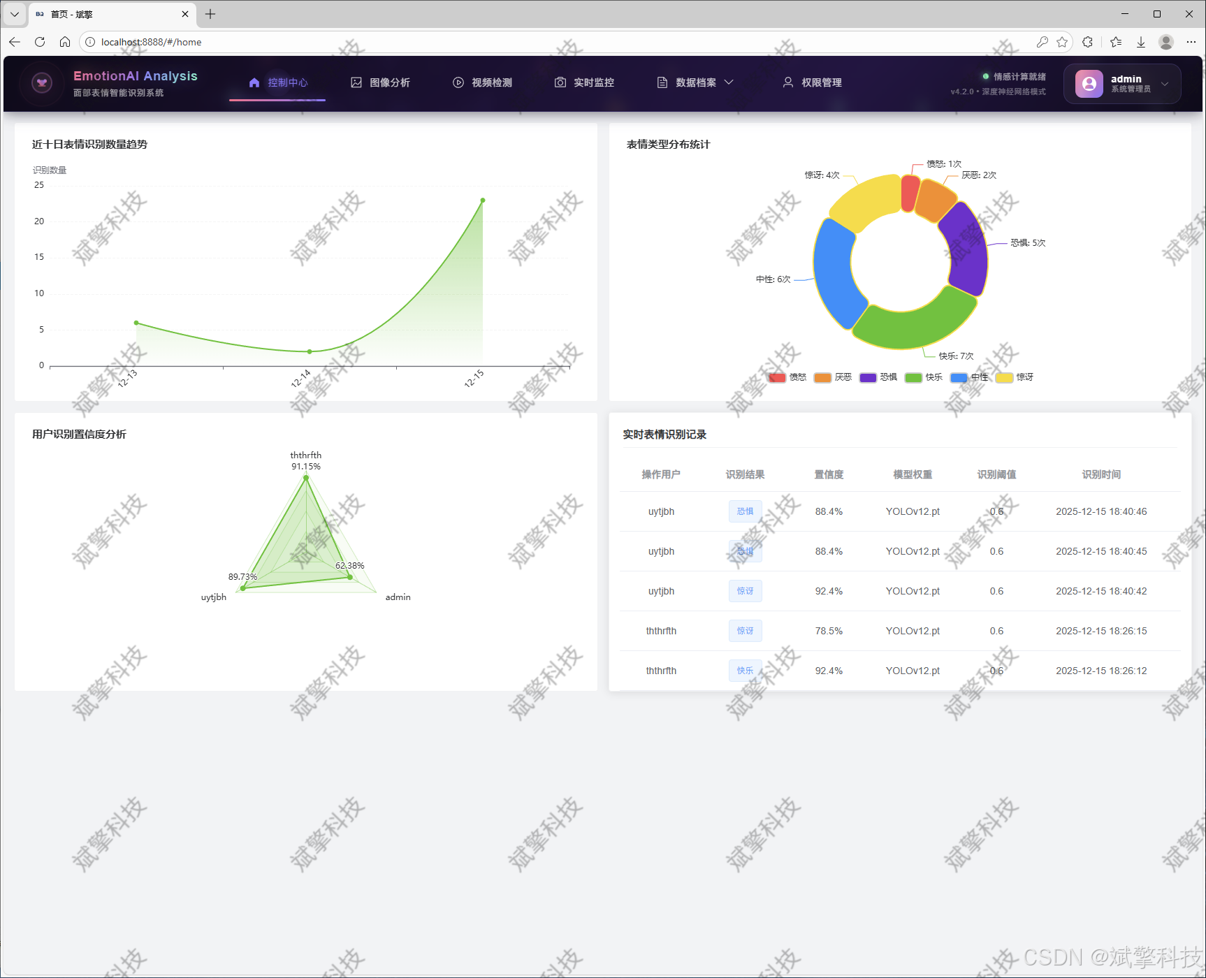 本研究设计并实现了一套高效、可扩展且用户友好的实时人脸表情识别系统。系统核心采用最前沿的深度学习目标检测架构——YOLO系列模型(支持YOLOv8至YOLOv12的动态切换),在包含‘愤怒’、‘厌恶’、‘恐惧’、‘快乐’、‘中性’、‘悲伤’、‘惊讶’七类表情的自有数据集上进行训练与优化。为实现便捷的交互与高效的管理,本系统创新性地构建了前后端分离的现代化Web应用:前端基于Vue.js框架提供直观的图形界面,后端业务逻辑由Spring Boot框架处理,而核心检测服务则通过Python实现,确保了算法性能与系统可维护性的平衡。系统功能全面,不仅支持图像、视频及摄像头实时流的在线检测与结果记录,还集成了DeepSeek大型语言模型的智能分析模块,对检测结果进行深度语义解读。所有检测记录与用户信息均持久化存储于MySQL数据库,并配备了完善的数据可视化看板与用户管理体系。实验结果表明,该系统在测试集上达到了优异的识别准确率,并通过多模型支持与模块化设计,为表情识别的研究与应用提供了一个功能强大且灵活的技术平台。