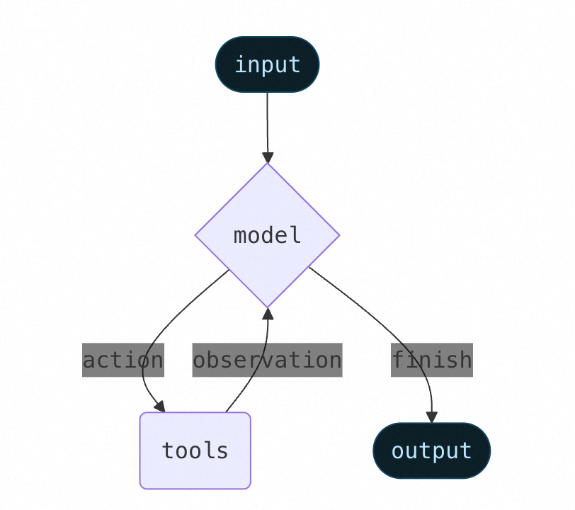 Agent的自主决策的能力是由模型驱动的,在首次调用LLM时将应用上下文、message、tools元信息一起发送给LLM,由LLM决定当前是否要调用tools执行外部工具,如果需要则会构建一个结构化输出用于请求外部的工具。因此其逻辑编排分为三个步骤进行: