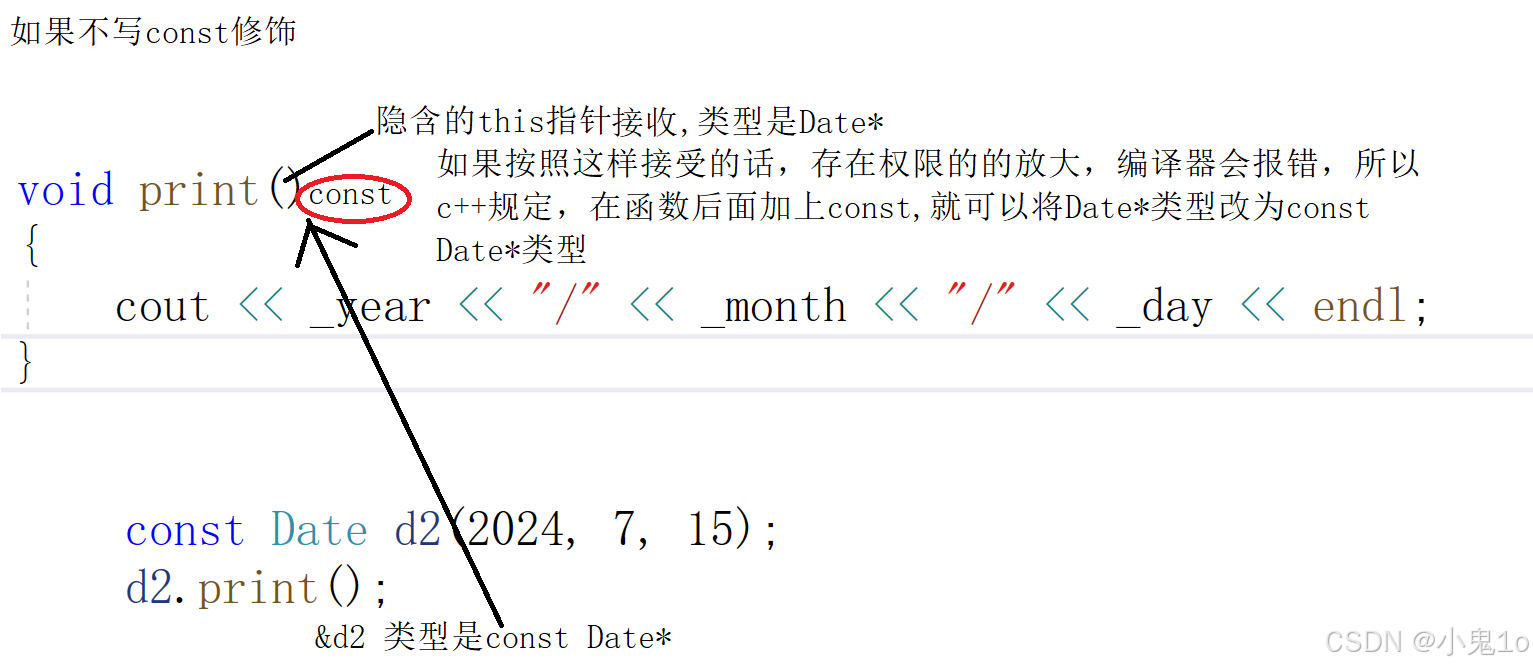 (1)将const修饰的成员函数叫做const成员函数,const修饰成员函数,将const放在成员列表的后面。