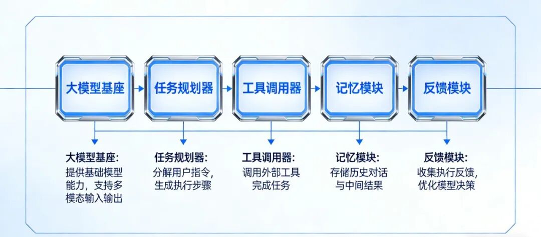 用户输入目标 → 大模型基座理解目标 → 任务规划器拆解任务 → 工具调用器调用对应工具执行小任务 → 记忆模块存储执行记录 → 反馈模块校验结果 → 若未完成,返回任务规划器调整步骤;若完成,输出最终结果
