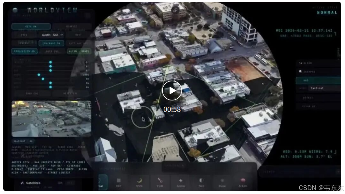 在一个 3D 地球仪上,你可以逐分钟回放整个打击行动的展开过程——德黑兰上空的空域清理、地面打击坐标锁定、9 个国家被划为禁飞区、观测卫星飞越打击区域。他原话说的是:无需"专有数据融合",一位拥有公共信号且热爱计算机图形和地理空间智能的开发者,就能构建出如此完整的图像。(感兴趣的盆友可以去 X 上搜 Bilawal Sidhu,或者直接访问 worldview4d.com,WorldView 平台预计四月公开发布。)