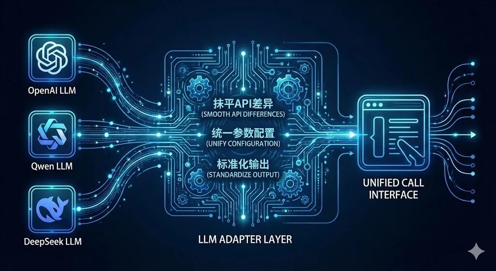 LLM作为Agent的“大脑”,负责逻辑推理与决策生成,但不同厂商的模型(如OpenAI、Qwen、DeepSeek)存在API接口、参数格式、输出规范的差异。框架的首要任务的是通过“适配层”抹平差异,实现对多模型的统一调用。