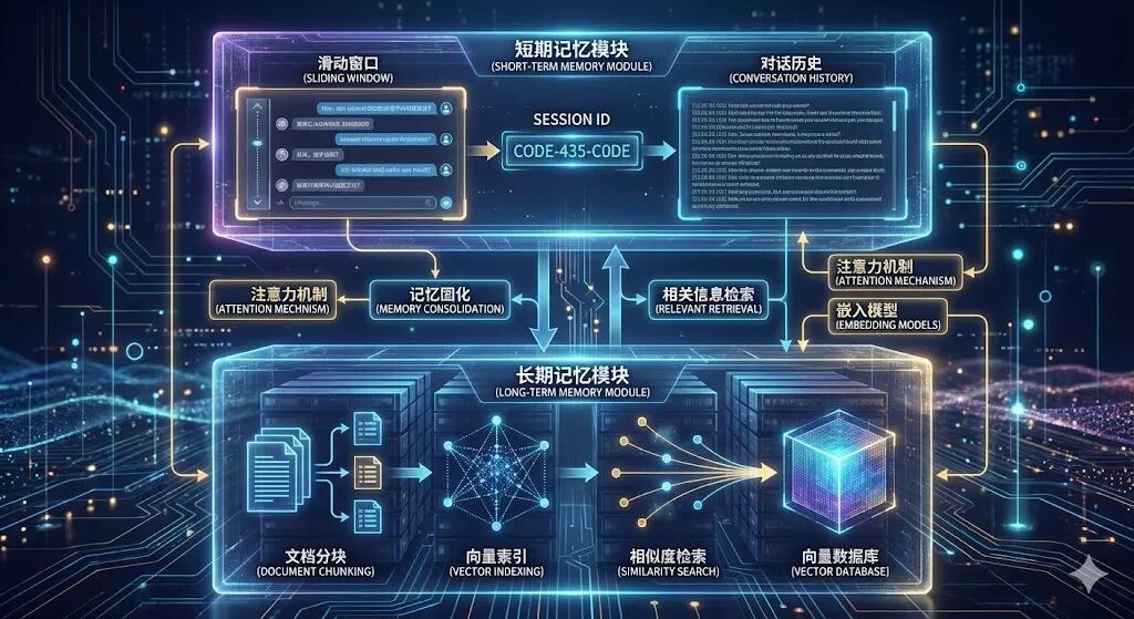 短期记忆:会话级上下文管理:聚焦于当前对话会话,通过滑动窗口策略保留最近N轮对话,截断早期无关内容,控制Token消耗。核心依赖Session ID机制,支持多用户并发会话,每个用户的对话历史独立存储。例如LangChain的RunnableWithMessageHistory、Qwen-Agent的messages列表,均通过会话标识实现记忆隔离。