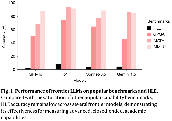 HLE一出来,GPT-4o和Claude 3.5 Sonnet等一众明星,所有柱状图都呈现出紧贴地面的可怜姿态。