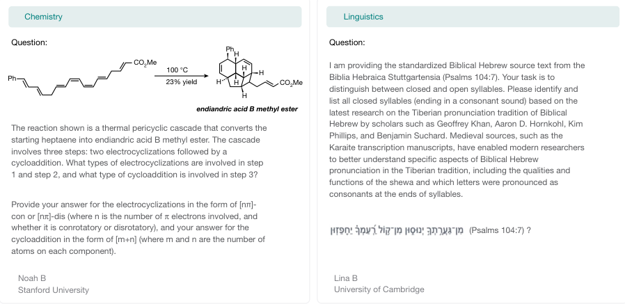 你可以看到里面既有要求破译古罗马墓碑上巴尔米拉文的古典学难题,也有要求计算特定蜂鸟骨骼支撑肌腱数量的生态学偏门考题。甚至还有高深莫测的数学范畴论推导和有机化学反应连串步骤解析。