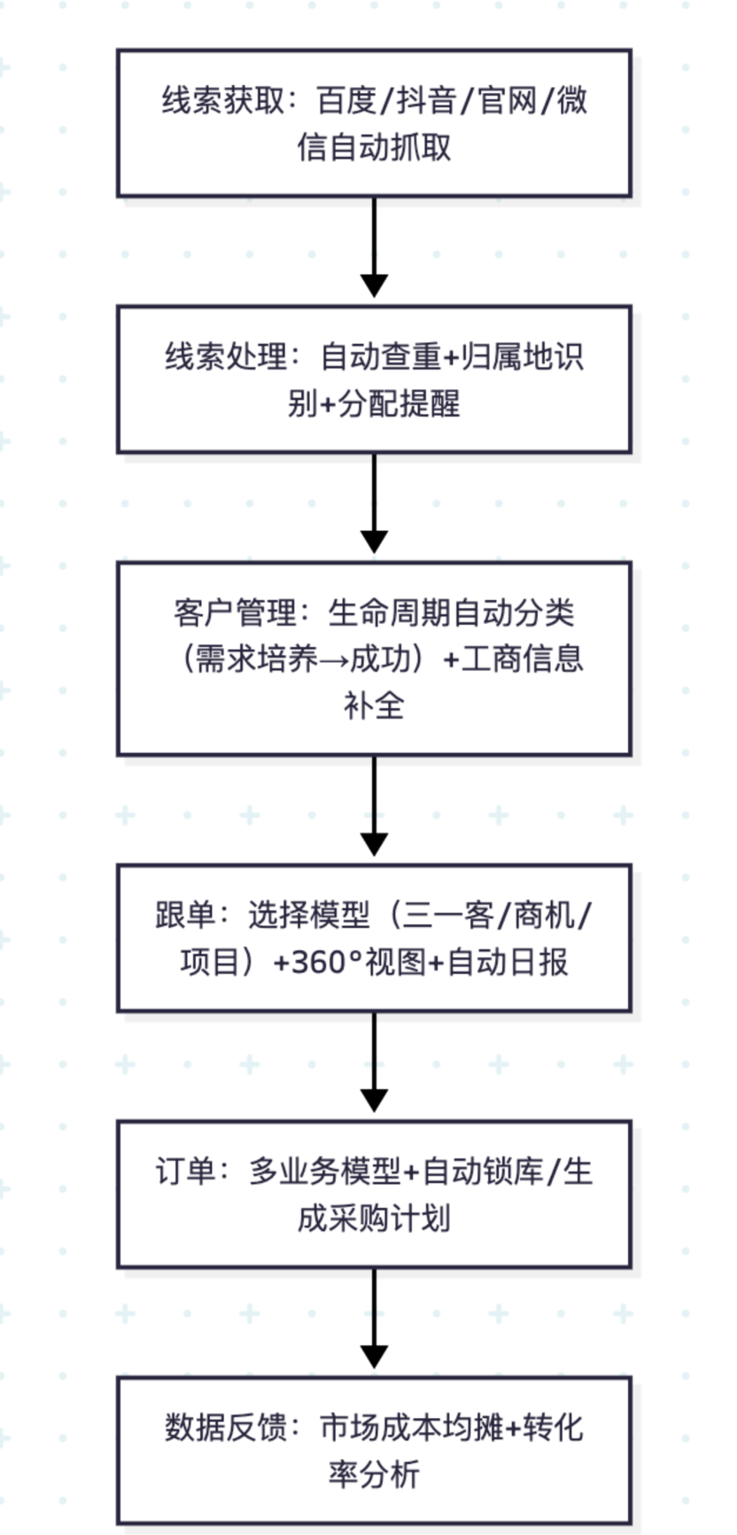 1. 线索:多渠道(百度/抖音/官网/微信)自动抓取+归属地/公司信息自动补全; 2. 客户:生命周期自动分类(需求培养→成功)+自动查重(手机号/企业简称); 3. 跟单:“三一客”(小单)/商机(长单)/项目(多方)模型+自动生成日报; 4. 订单:多业务模型(服务/实物/特殊)+自动锁库/生成采购计划。 |