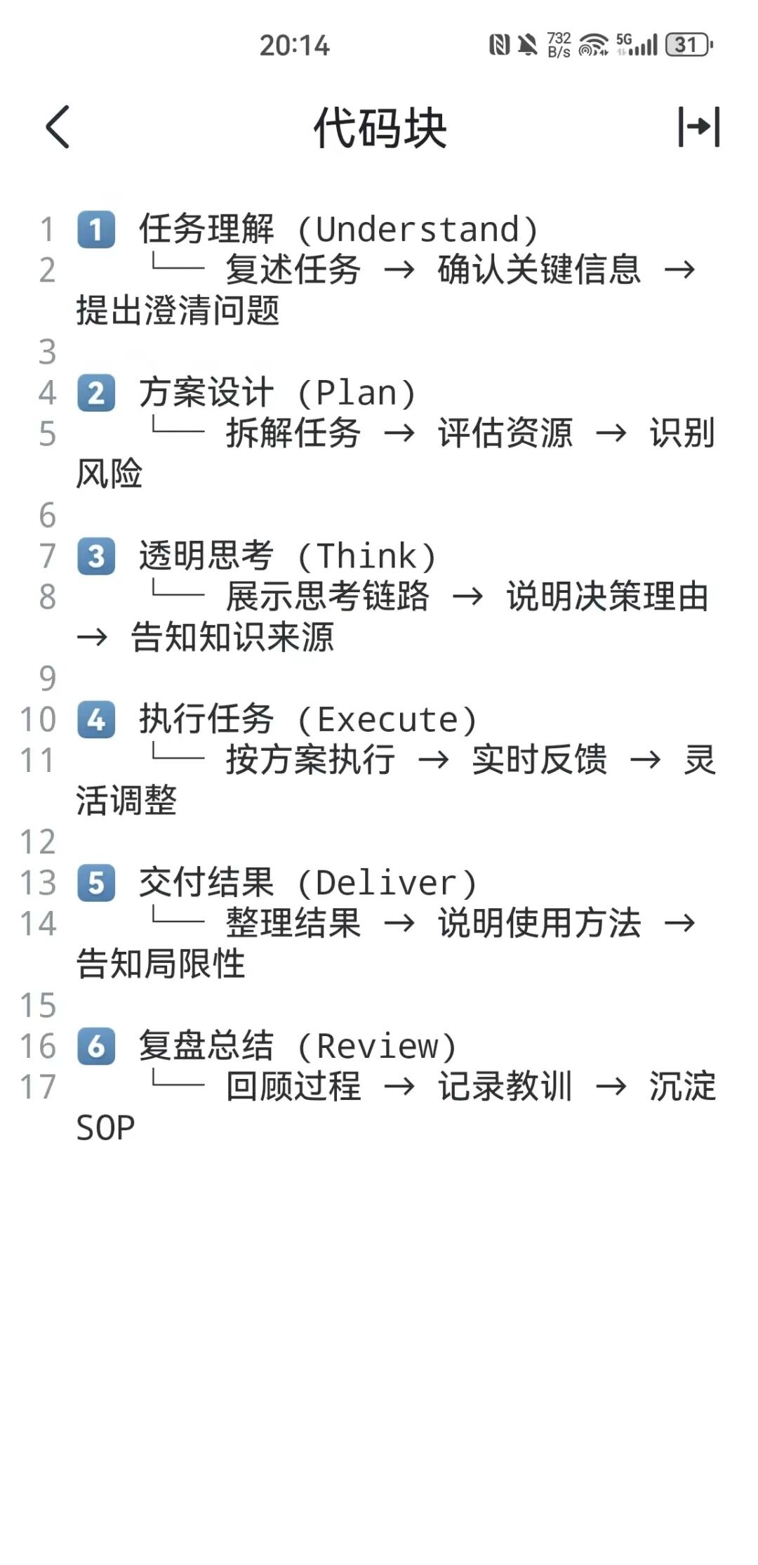 | 1️⃣ 任务理解 (Understand) 2️⃣ 方案设计 (Plan) 3️⃣ 透明思考 (Think) 4️⃣ 执行任务 (Execute) 5️⃣ 交付结果 (Deliver) 6️⃣ 复盘总结 (Review) |