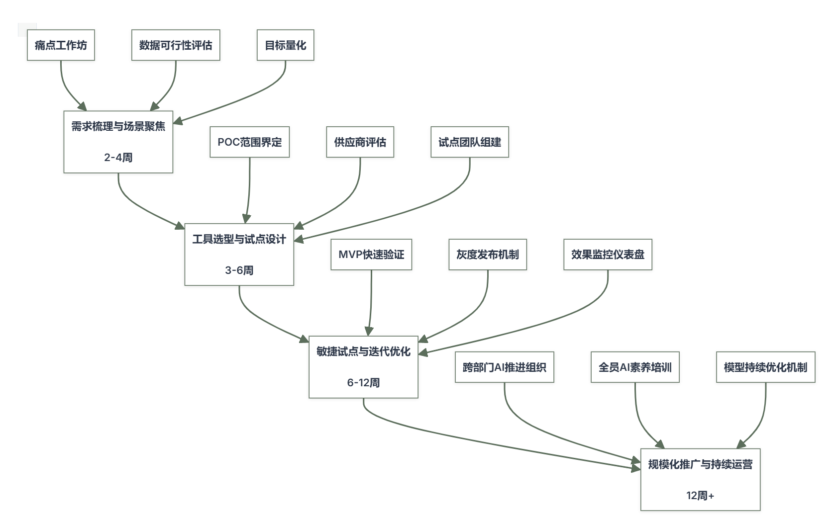 需求梳理与场景聚焦(2-4周):痛点工作坊识别3-5个核心高频痛点,数据可行性评估,目标量化转化为可追踪KPI,参考实施方法论