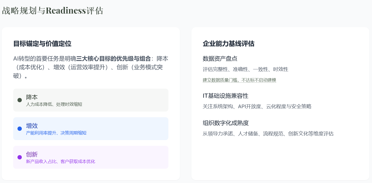AI转型的首要任务是明确三大核心目标的优先级与组合:降本(成本优化)、增效(运营效率提升)、创新(业务模式突破)。企业能力基线评估