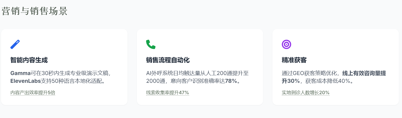 具体应用:AI内容生成(AIGC):自动生成小红书/抖音文案、产品海报、短视频脚本。将原本需要设计师和文案几天的工作缩短至几分钟,成本降低90%。智能外呼与线索清洗:利用AI语音机器人进行首轮客户触达和意向筛选,将人工销售从枯燥的“盲打”中解放出来,专注于高意向客户的跟进。报告显示,头部应用企业销售人均产能提升了3倍。个性化推荐与私域运营:基于用户历史行为,AI自动推送个性化的产品建议和优惠券,提升复购率。"我们部署AI聊天机器人后,每月节省330小时人力,自动解决率高达85%。