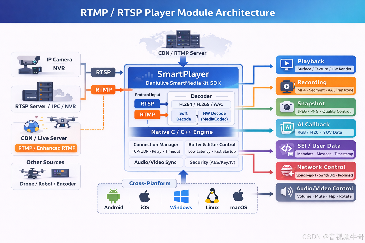 RTSP/RTMP 播放“能出画面”很容易,“低延迟 + 高兼容 + 可运维 + 可扩展”才是难点。本文基于大牛直播 SDK(SmartMediaKit)Android 端 SmartPlayer Demo 真实代码结构,拆解三层架构(Activity→线程安全封装→JNI 内核),讲清 RTSP/RTMP 规范相关配置、秒开/超低延迟组合调参、软硬解与 HW Render 取舍、录像/快照/AI