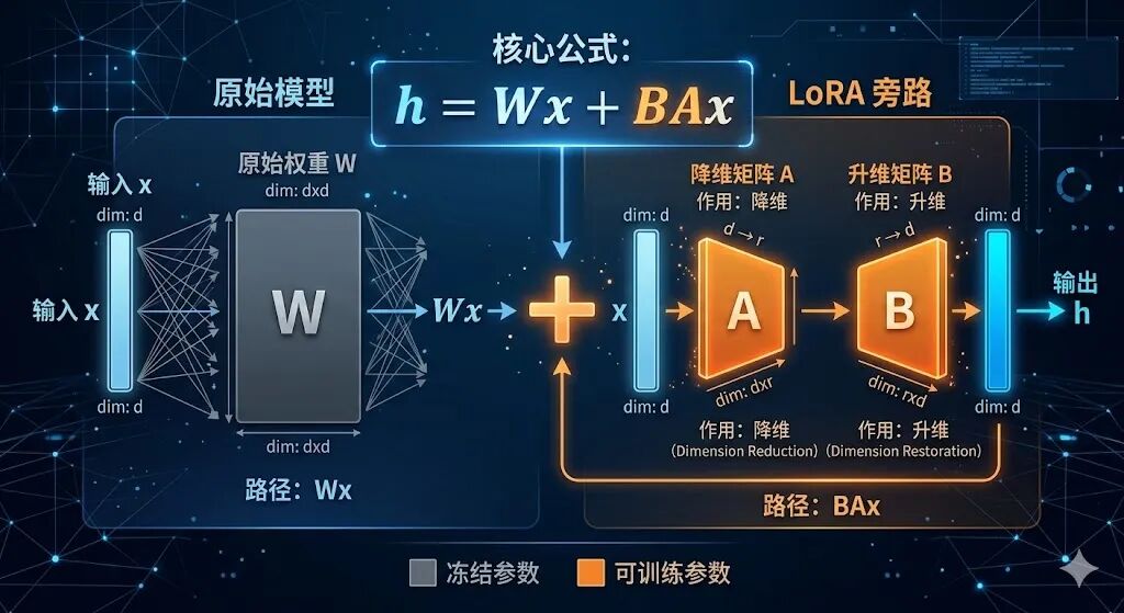 三、重点拆解:LoRA的数学原理与核心逻辑(最实用的微调方法)