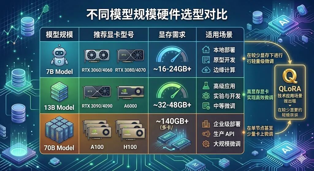 •70B模型:必须使用QLoRA技术+多卡部署(如2张A100 40GB),单卡无法承载,适合企业级场景;