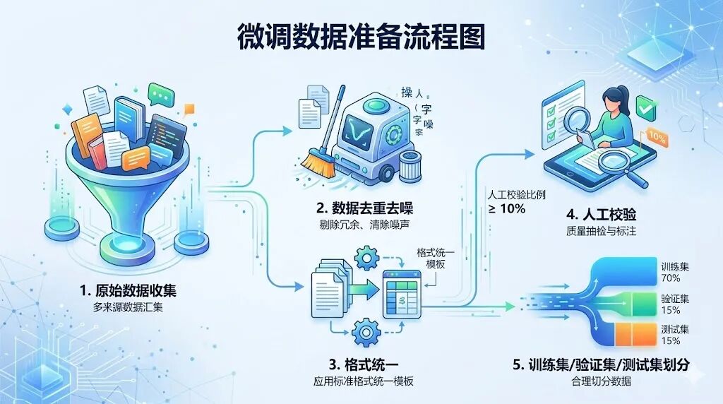 很多人在微调时,容易陷入“重模型、轻数据”“重方法、轻硬件”的误区。实际上,数据质量直接决定微调效果,硬件配置决定微调能否顺利进行。这部分我们结合PDF内容,补充数据清洗技巧、硬件选型细节,让大家能直接落地实操。
