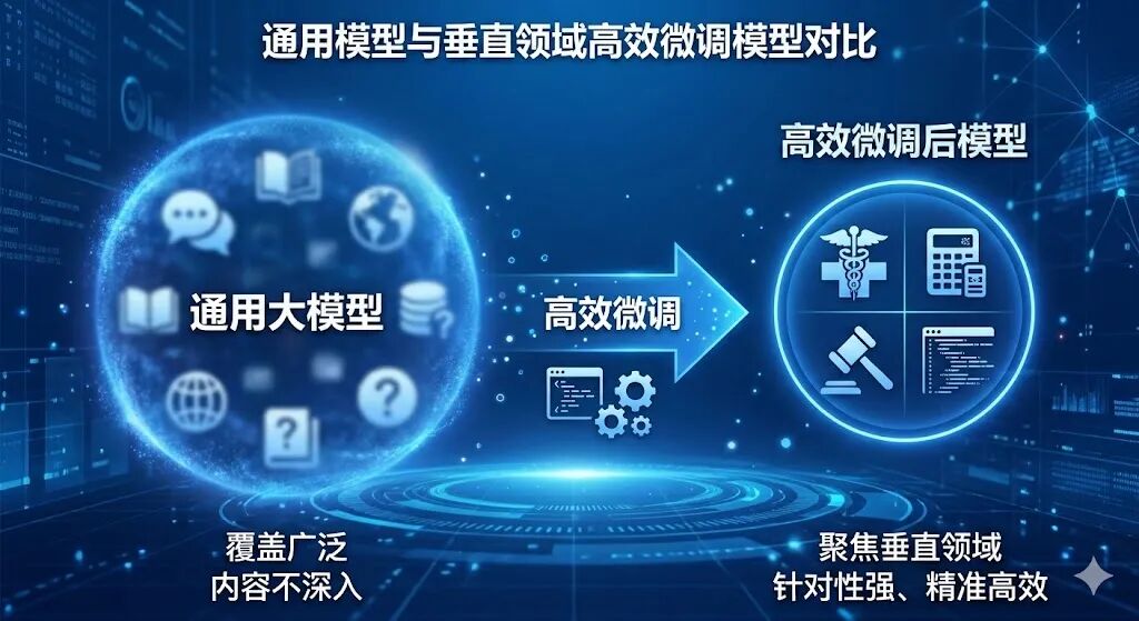 这就是“高效微调”存在的意义——在不改变模型核心权重、不消耗巨额算力的前提下,通过训练少量参数,让大模型快速适配特定任务,实现“小成本、高收益”的落地效果。