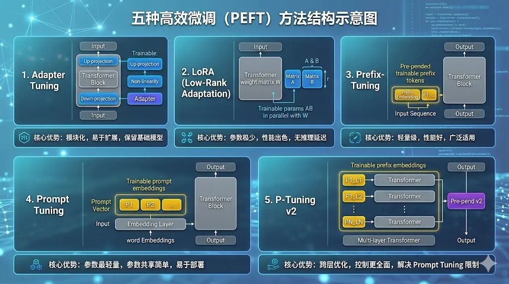 高效微调的核心逻辑是“冻结预训练模型权重,仅训练少量额外参数”,不同方法的差异在于“训练参数的位置”和“参数规模”。目前行业内最常用的有5种方法,我们结合技术细节和实践场景,逐一拆解,补充PDF之外的实用细节。