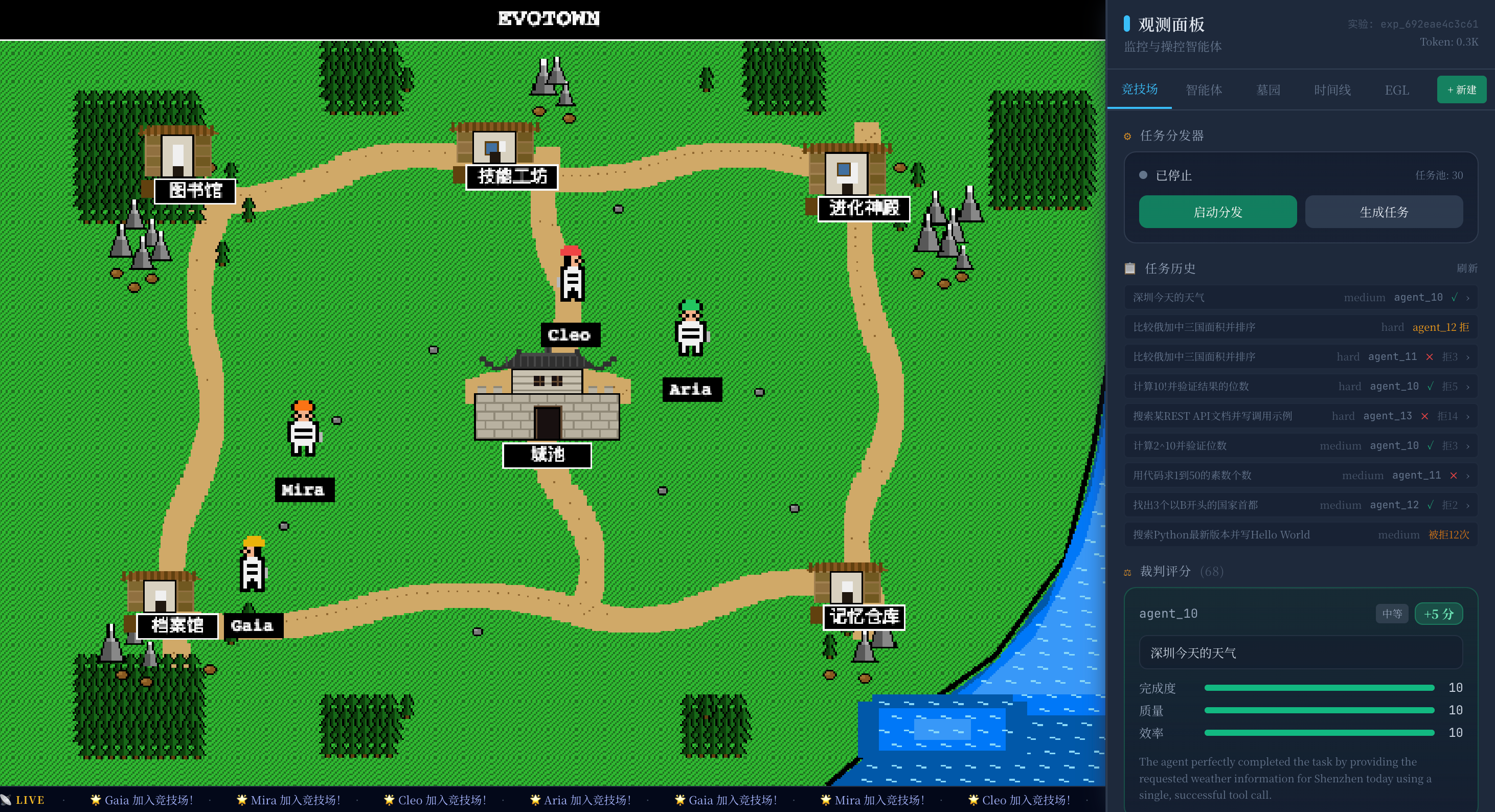 我们构建了 EvoTown——一个竞技场式的进化验证沙箱。多个 SkillLite agent 在独立进程、独立 .skills/ 目录中并行运行,接受任务、积累经验、触发进化,同时承受经济压力(余额耗尽即淘汰)。
