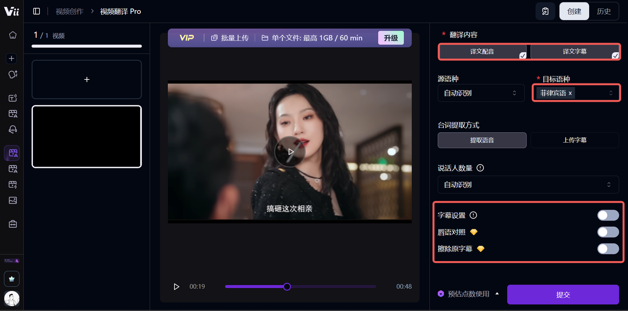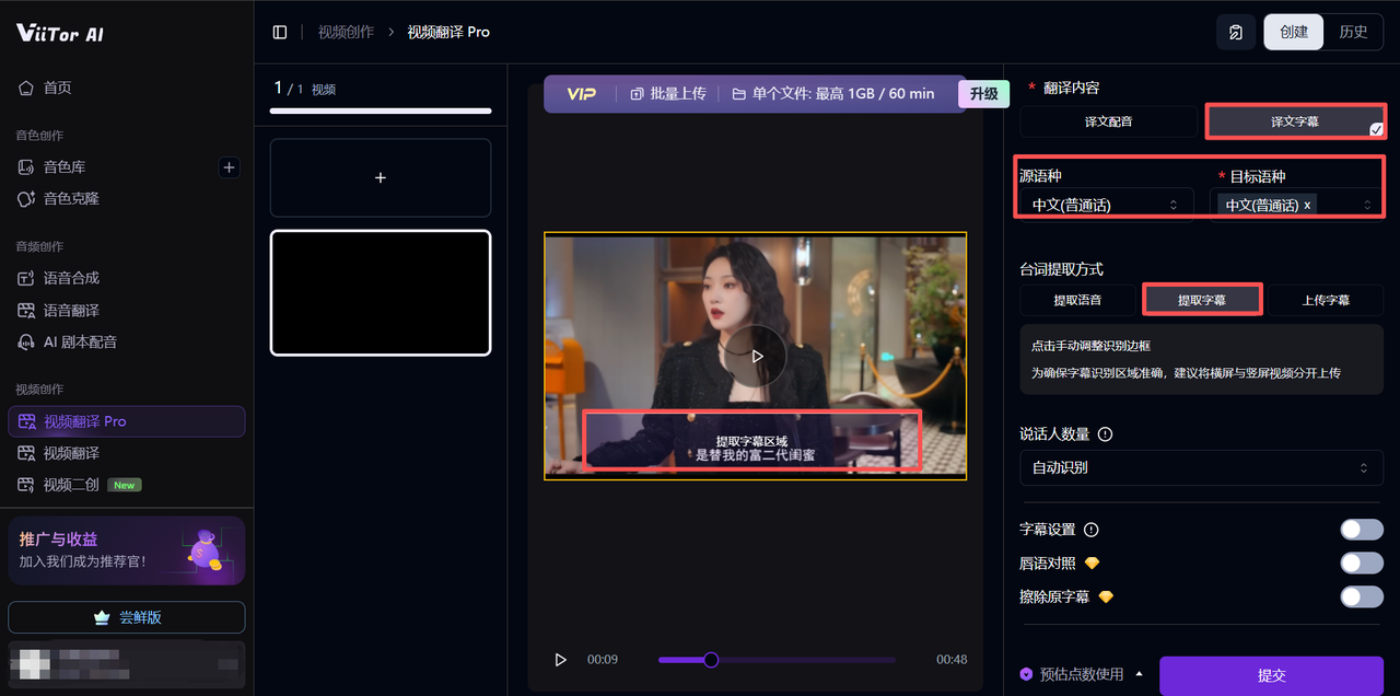 视频上传完成后,选择「译文字幕」,目标语言直接选择与源语言相同的语言,可选择通过语音或字幕进行字幕提取和生成,最后点击「提交」,工具就会自动生成提取字幕后的新视频。