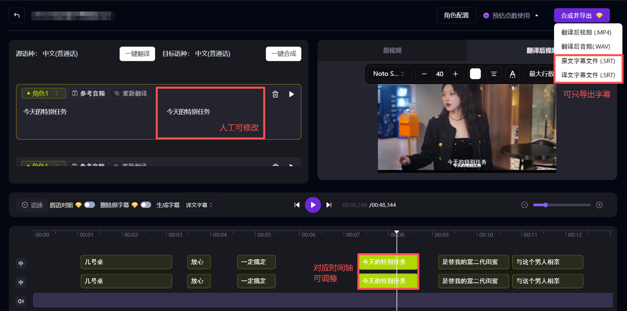字幕生成后建议人工核对,发现错误可直接在工具内修改文本和对应时间轴。右上方可以选择只导出字幕,可用于后续视频加字幕,或直接作为文字稿阅读。