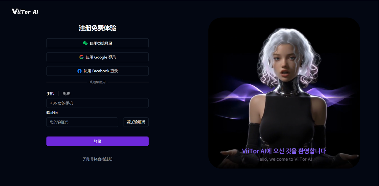 先登录 ViiTor AI,未注册用户可通过邮箱、手机号快速注册,或用社交账号注册登录。