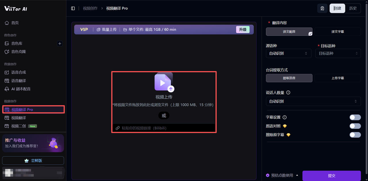 使用 ViiTor AI 的在线自动字幕生成器 — 视频翻译 Pro 功能,可以便捷地把视频字幕提取为文本文件,工具会自动生成字幕,支持直接检查和修改,保证内容准确,只需要浏览器和待上传的视频即可。