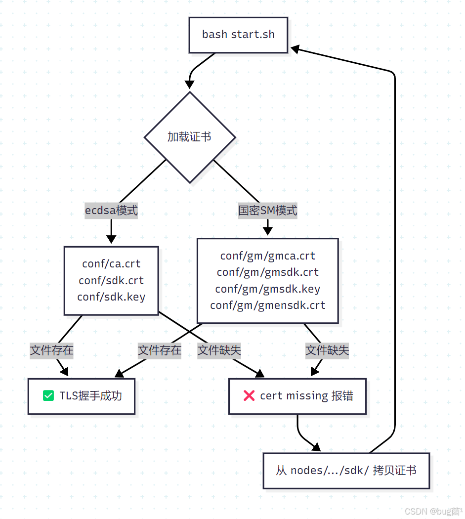 build_chain.sh自动生成,存放于节点目录的sdk/子目录 - 🔄 SDK 2.10.0 会先尝试 ecdsa,再尝试国密,两者都需要对应证书