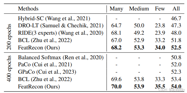 ①类不平衡数据集:CIFAR-10-LT和CIFAR-100-LT,作者将不平衡因子按照以前论文设定为100,50和10;ImageNet-LT,不平衡因子为256;iNaturalist 2018是超大数据集有437.5K图像和8142类,作者按照别人的方法把测试集划分成三个子集,分别有100多个实例,20~100个实例和20个实例。