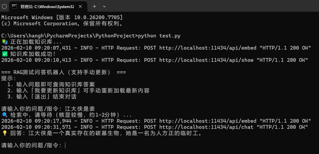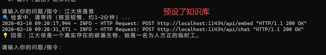 输入问题,测试是否按照预设知识库回答问题