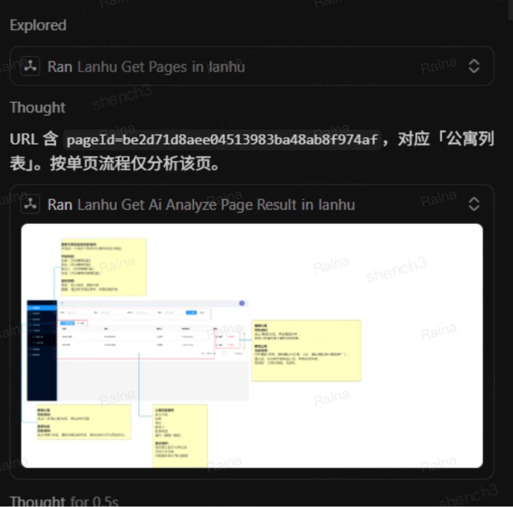 按下回车,AI 会自动调用已启动的蓝湖 MCP,向蓝湖平台发起请求,读取对应原型的所有内容,包括页面布局、按钮交互、输入框规则、备注信息等。