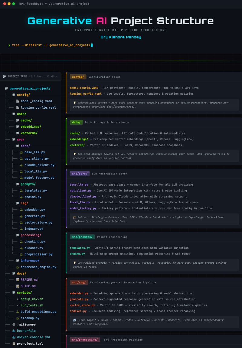 本文将完整拆解这套经过生产验证的企业级生成式 AI 项目结构,讲清每一个目录的设计逻辑、解决的核心痛点、以及背后的工程化最佳实践,帮你从一开始就搭建出可扩展、可维护、可测试的生产级 AI 系统。