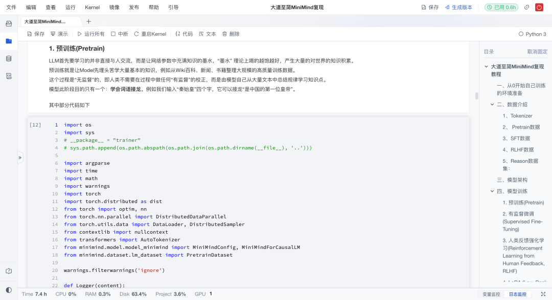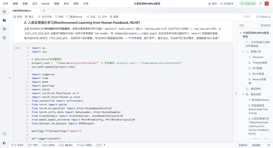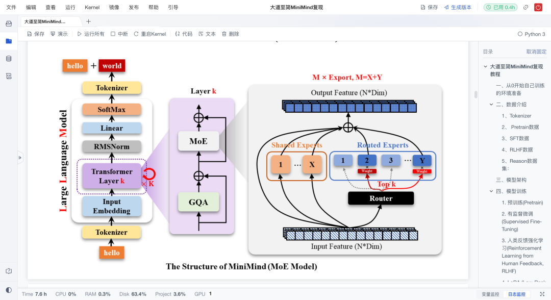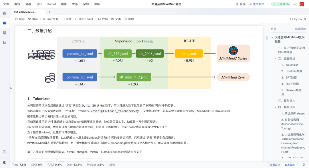 从预训练(词语接龙式学习)到SFT(对话能力提升),再到RLHF(人类偏好对齐),最后尝试Reason蒸馏,项目展示了一个完整的小模型成长过程。配合代码示例,读者不仅能看懂,还能跑通。