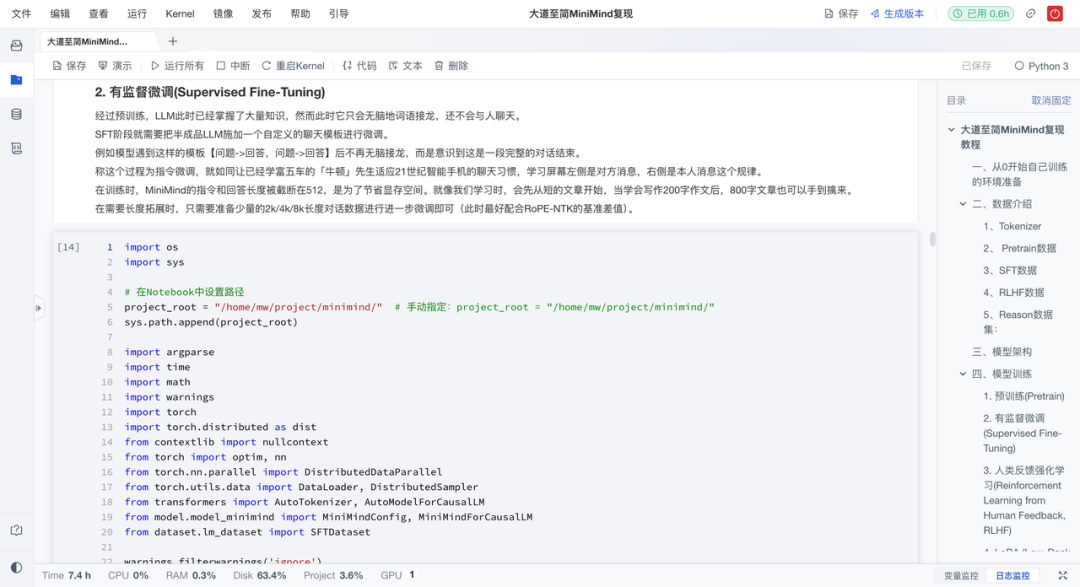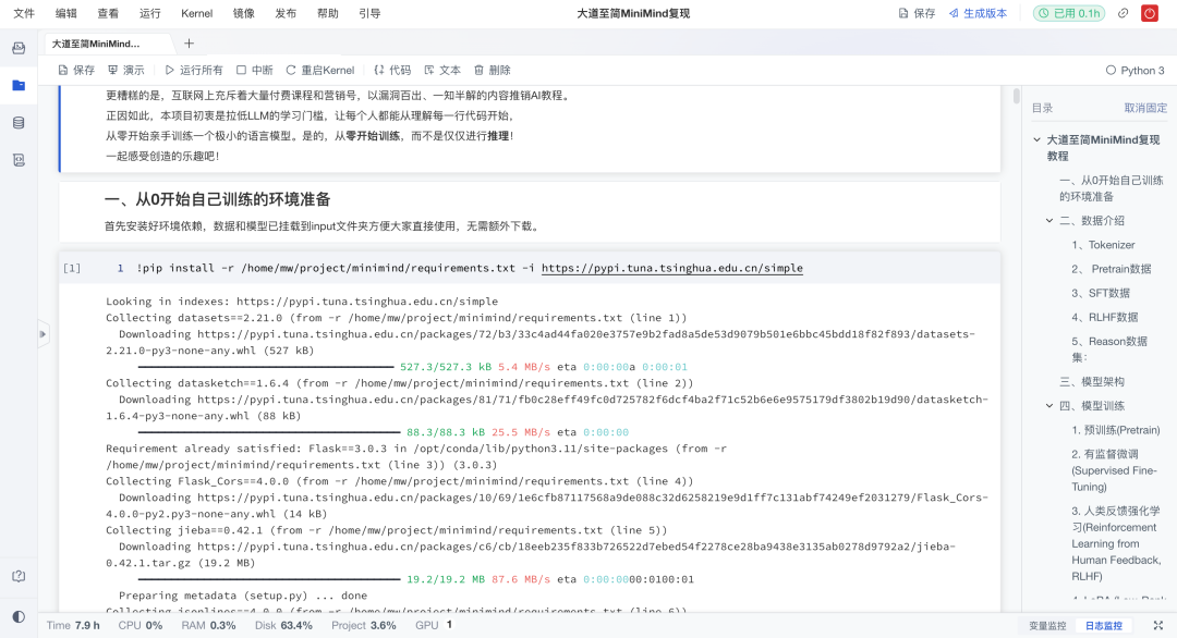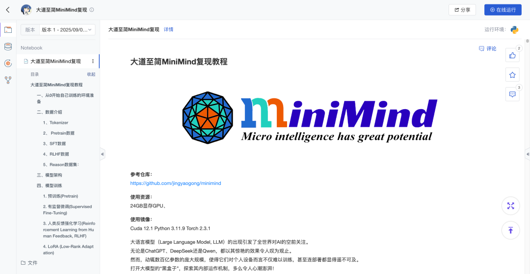 本期推荐的和鲸社区创作者 @天海一直在AI 分享的大道至简MiniMind复现项目,正是这样一个实践入口:用简化的方式,从零开始亲手复现一个小型语言模型(Mini LLM)。