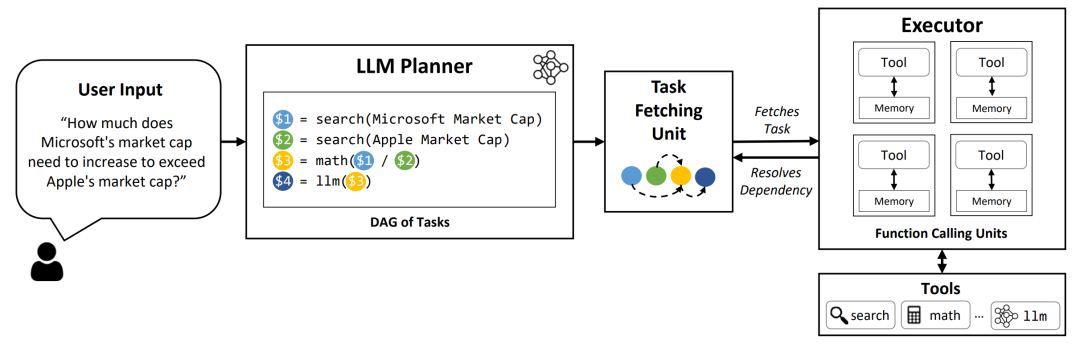 LLM Compiler架构被设计为进一步提升任务执行速度,其核心思想是让Planner生成一个任务的有向无环图(DAG),而非简单的列表 。这个任务图清晰地定义了所有任务、所需的工具、参数以及任务间的依赖关系。一个独立的任务调度单元会根据这个DAG,自动并行执行所有依赖已满足的任务,从而实现最大化的并发执行,提供显著的速度提升 。