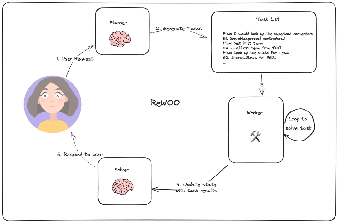优点: ReWOO通过一次性规划整个任务链,避免了ReAct中反复调用LLM所产生的冗余提示词和历史上下文,因此显著减少了Token消耗,提高了Token效率。此外,由于规划数据在理论上不依赖于工具的实时输出,该架构简化了模型的微调过程 。
