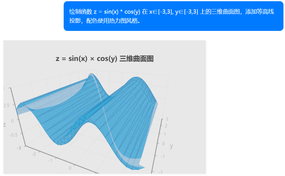 输出效果:生成交互式三维曲面图(可旋转),底部带有等高线投影,颜色映射清晰。
