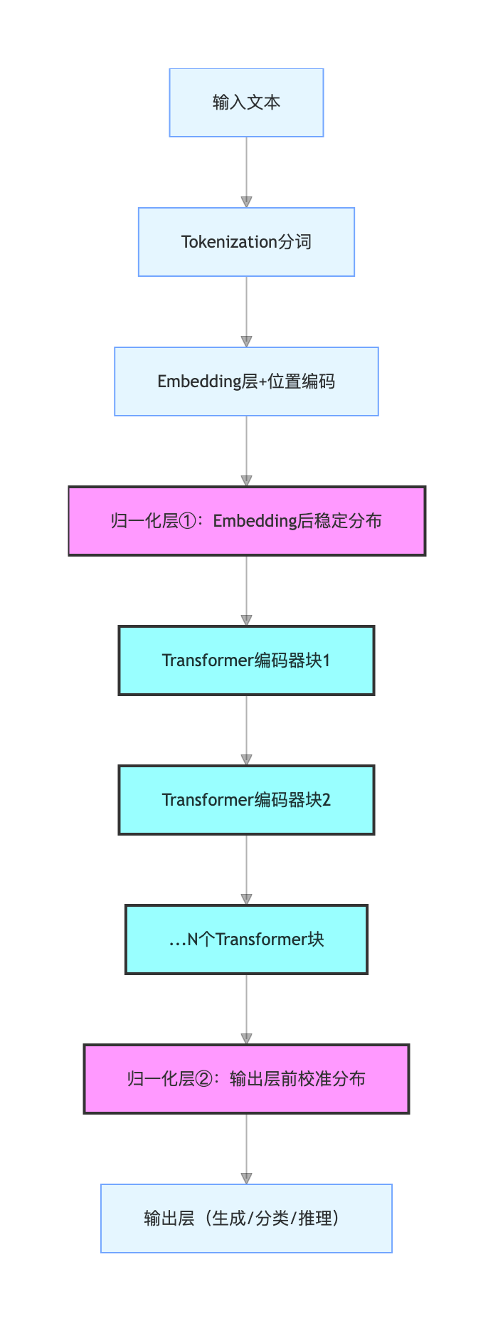 - ① Embedding 后归一化:统一词向量和位置编码的分布,避免初始特征波动过大;