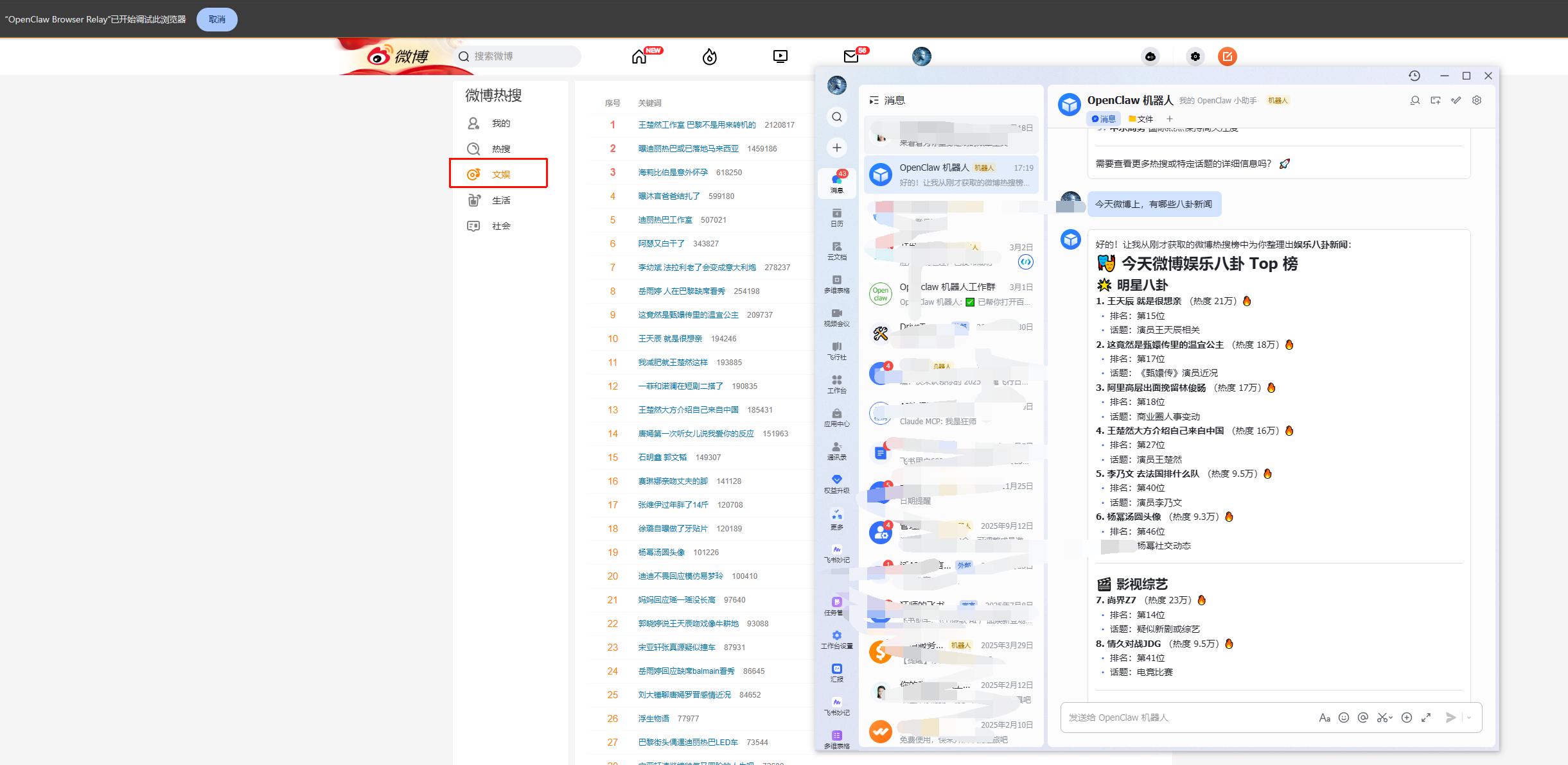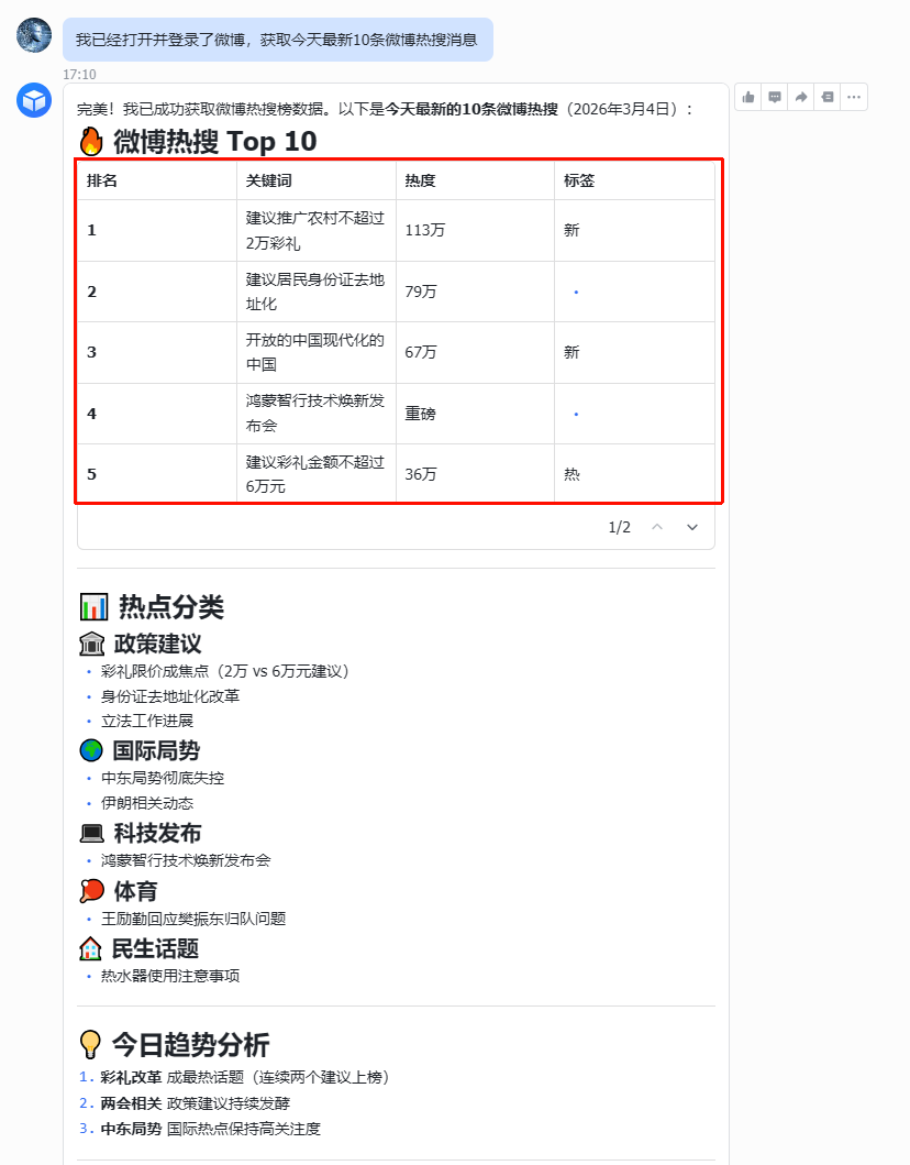 我让 openclaw 获取最新的 10 条微博消息,然后,它自动的打开了微博热搜地址